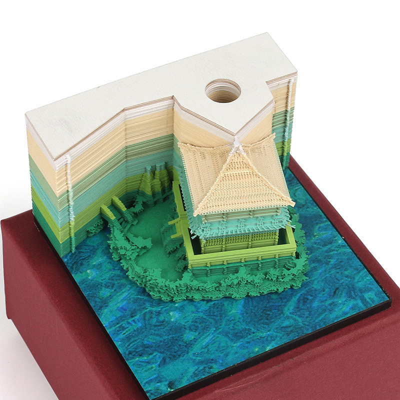 Each sheet reveals more of the detailed temple and surrounding scenery. As a result, the memo pad slowly becomes a beautiful architectural display. You can write reminders, plans, and daily notes while watching the design appear.